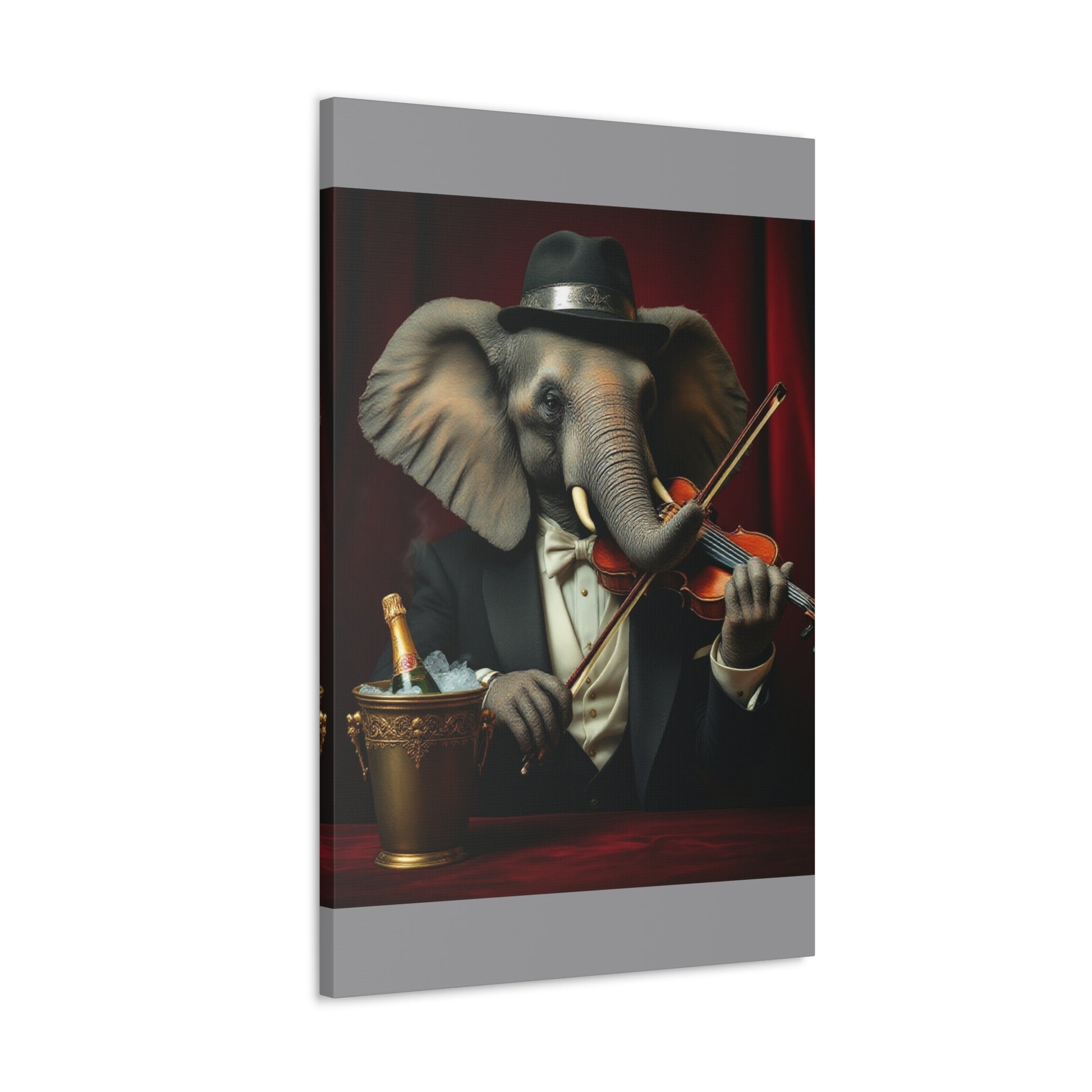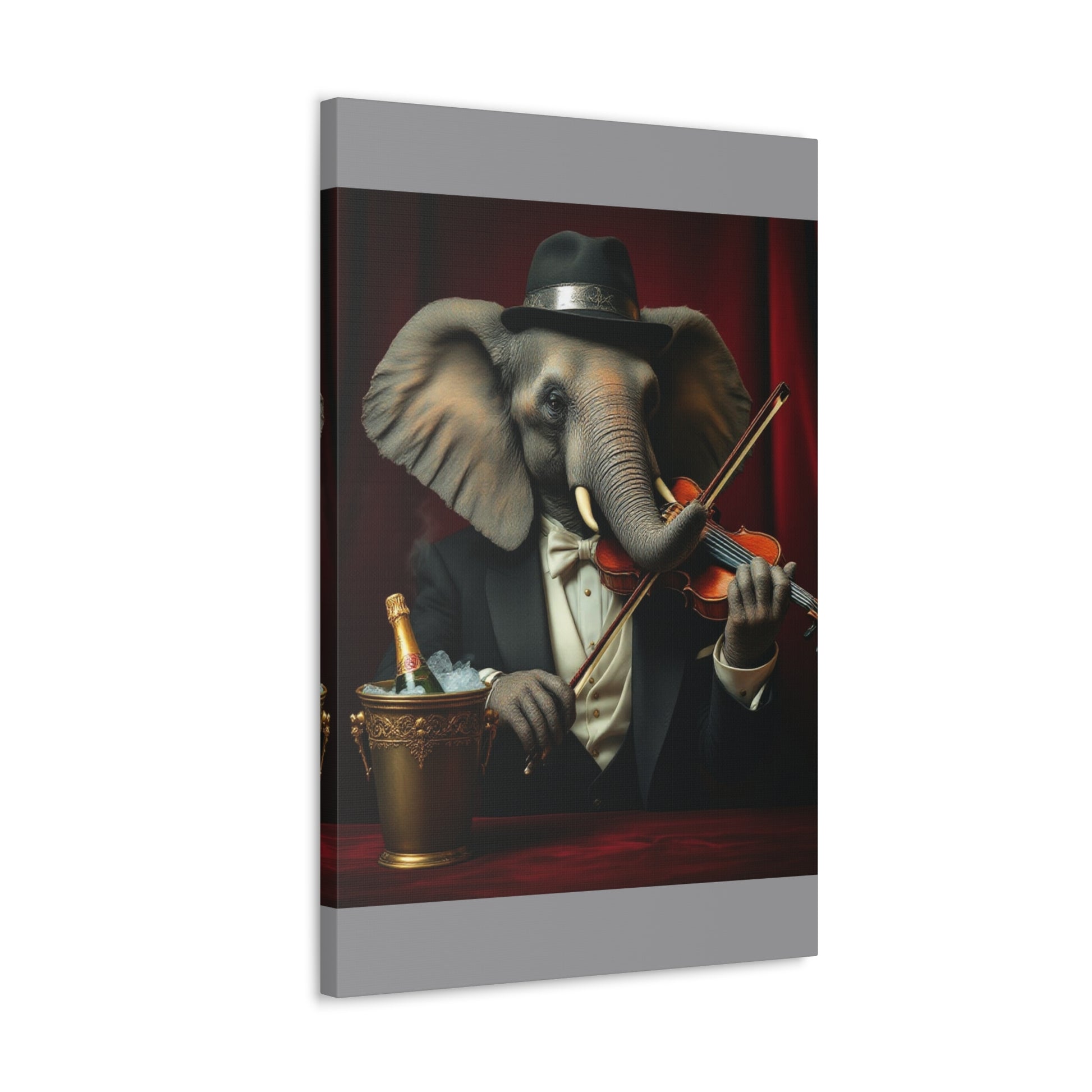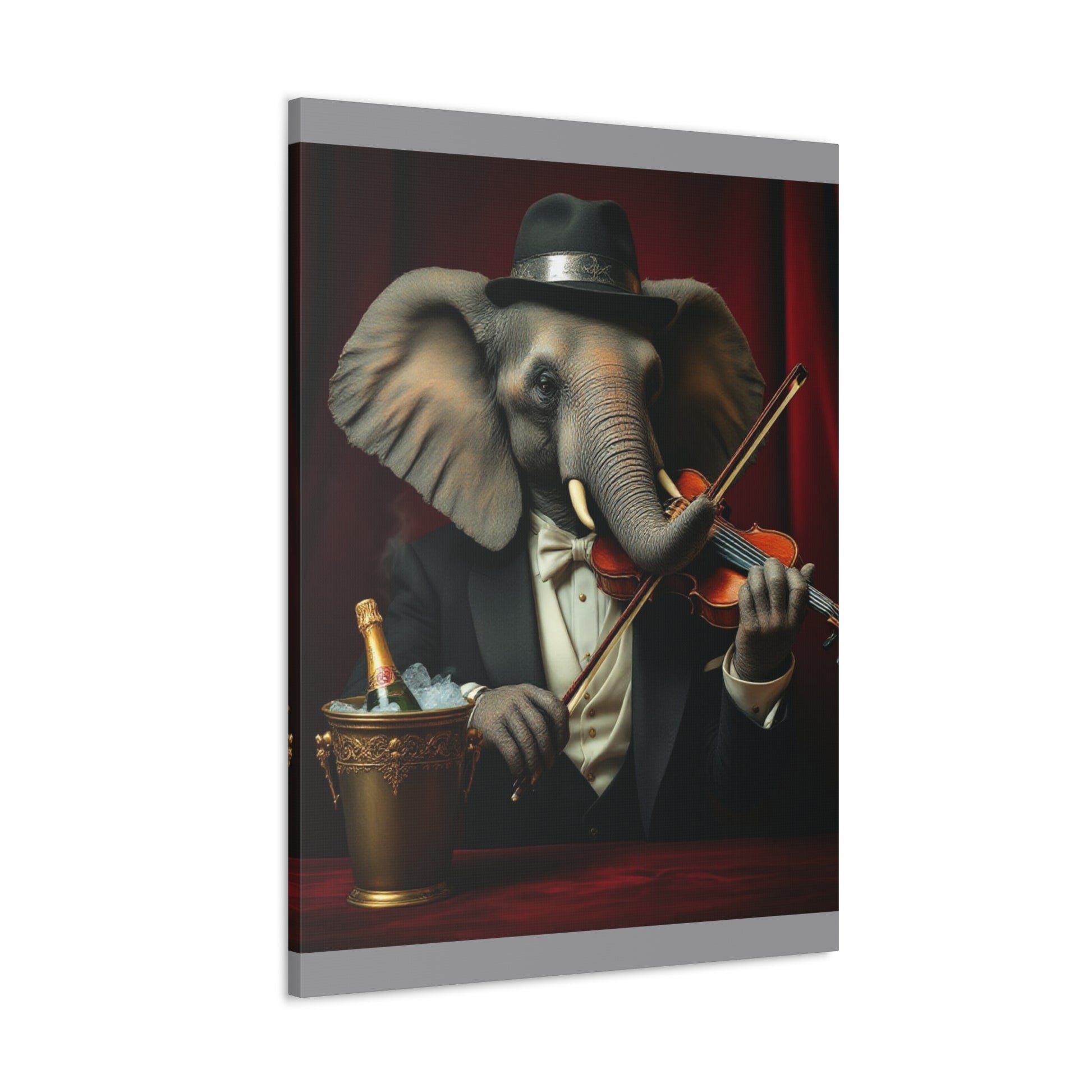 Meet Maestro Pachyderm: The Most Sophisticated Elephant in the Room! This gallery wrap brings class to your walls and a chuckle to your guests. Our dapper elephant violinist isn't just well-dressed—he's well-tusked and ready to serenade your living space with silent symphony. He's mastered the violin despite having absolutely no formal training (and trunks instead of fingers).