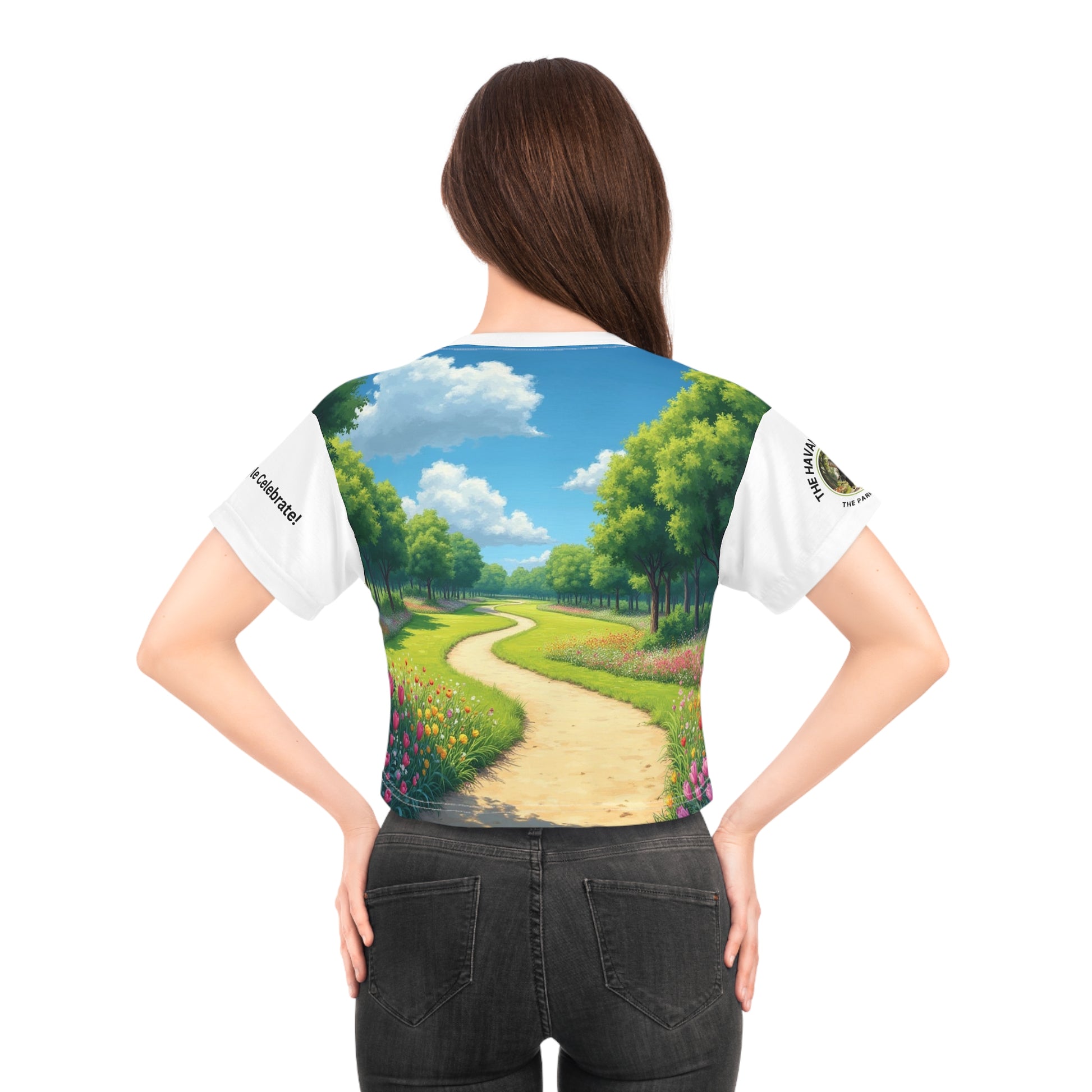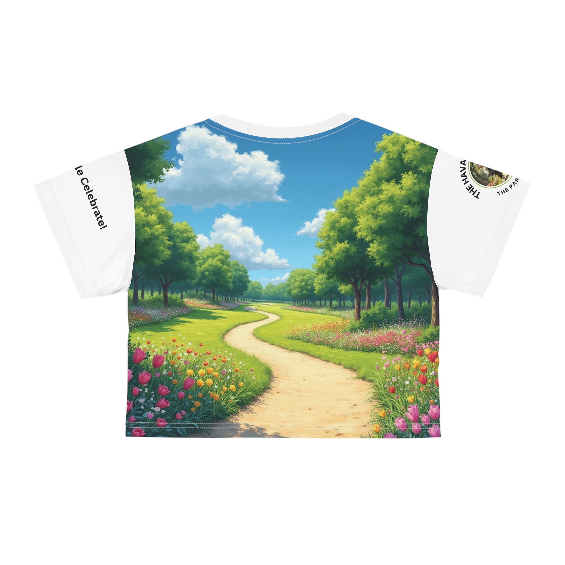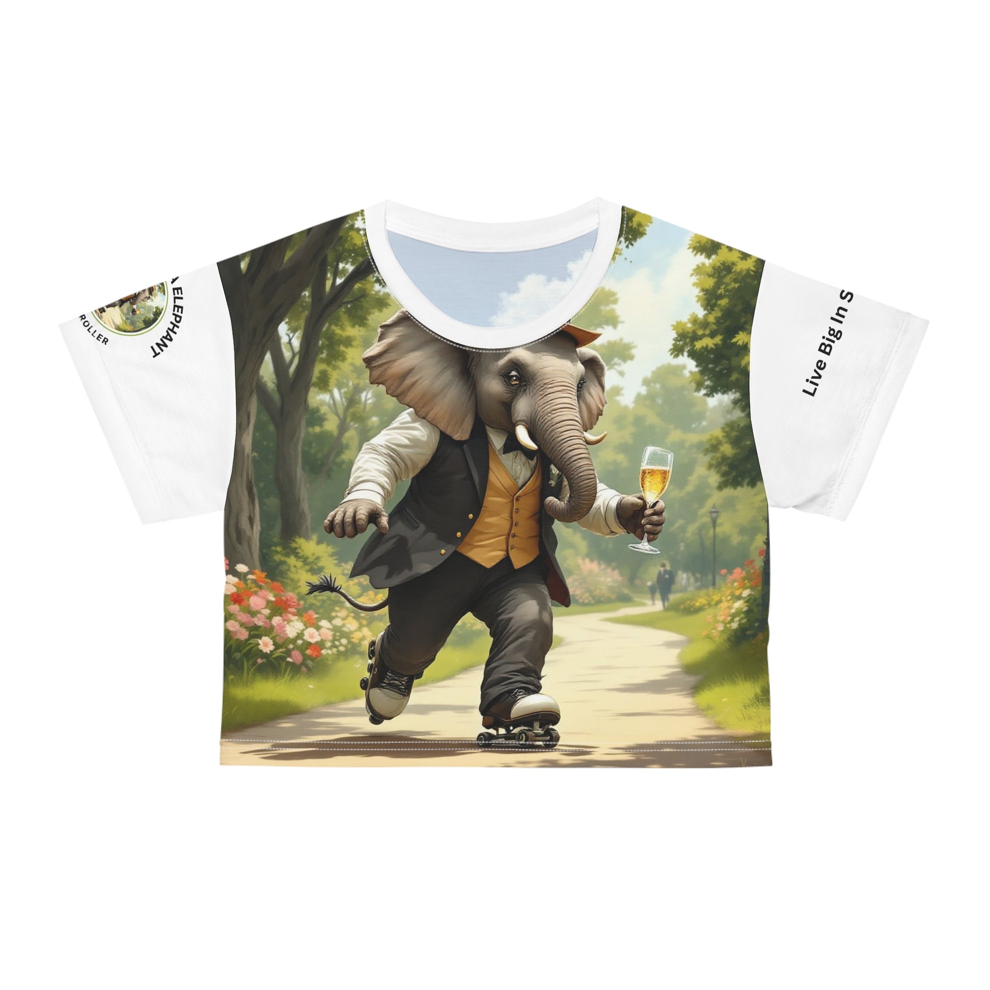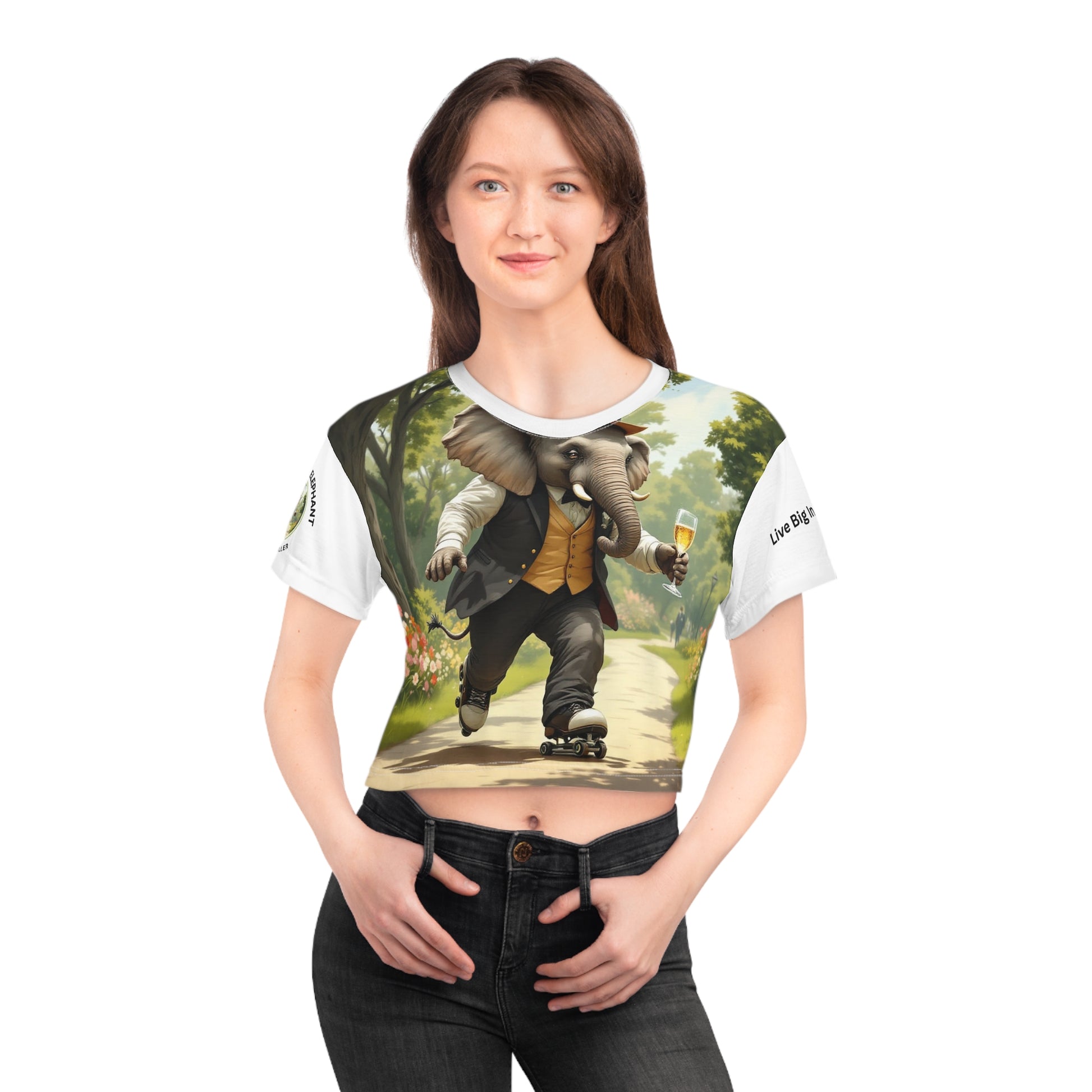 Vibrant Crop Tee featuring an image of an Elephant wearing a cuban hat, roller skating in a park holding a glass of champagne. Perfect for those who love unique and playful designs. Ideal for summer outings, casual hangouts, and music festivals.