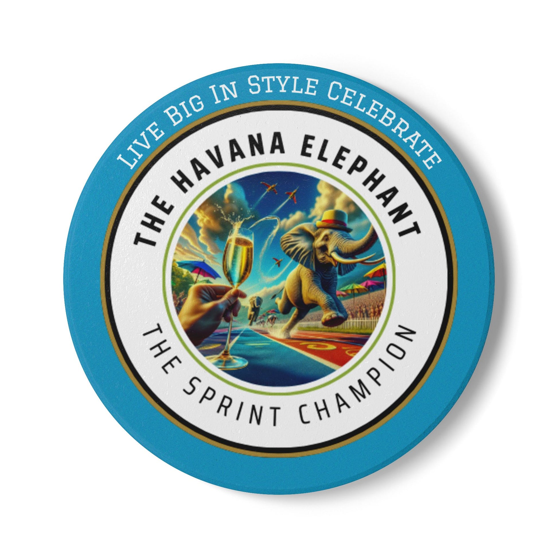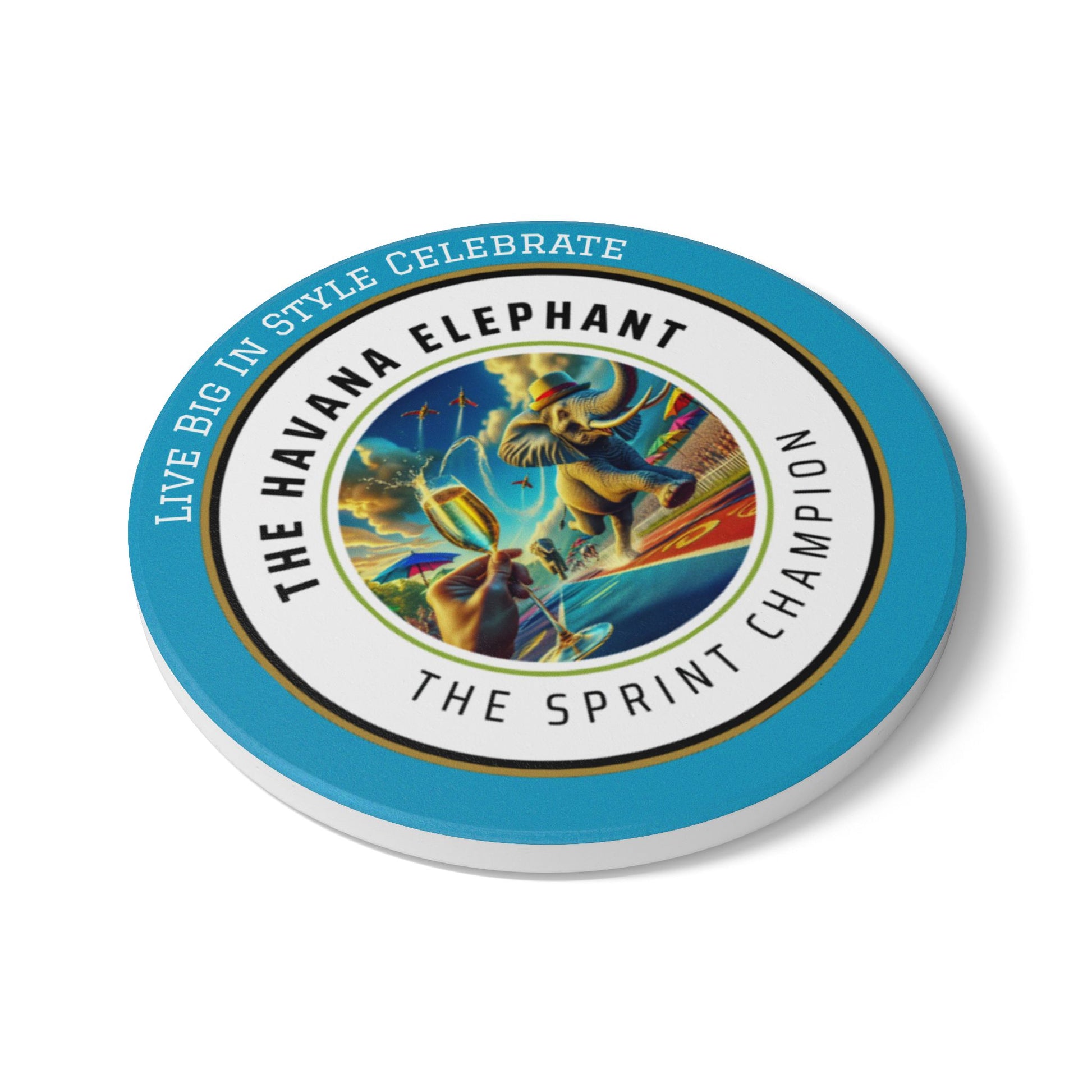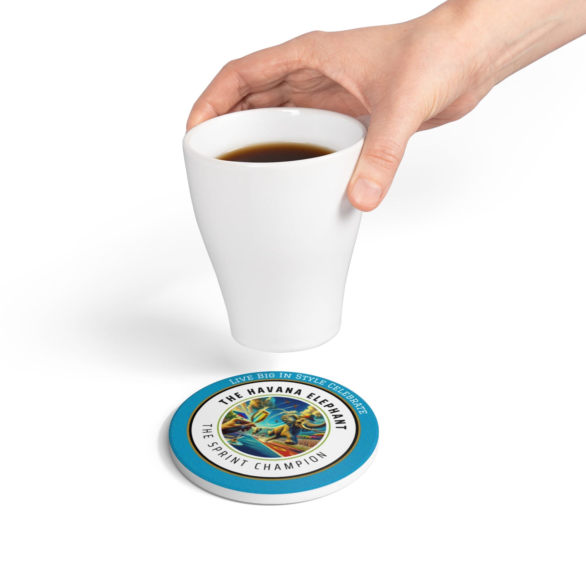 Elephant Themed Ceramic Coaster, The Sprint Champion. Unique Home Decor, Gift for Animal Lovers, Celebratory Coaster for Parties, Kitchen Table Accent