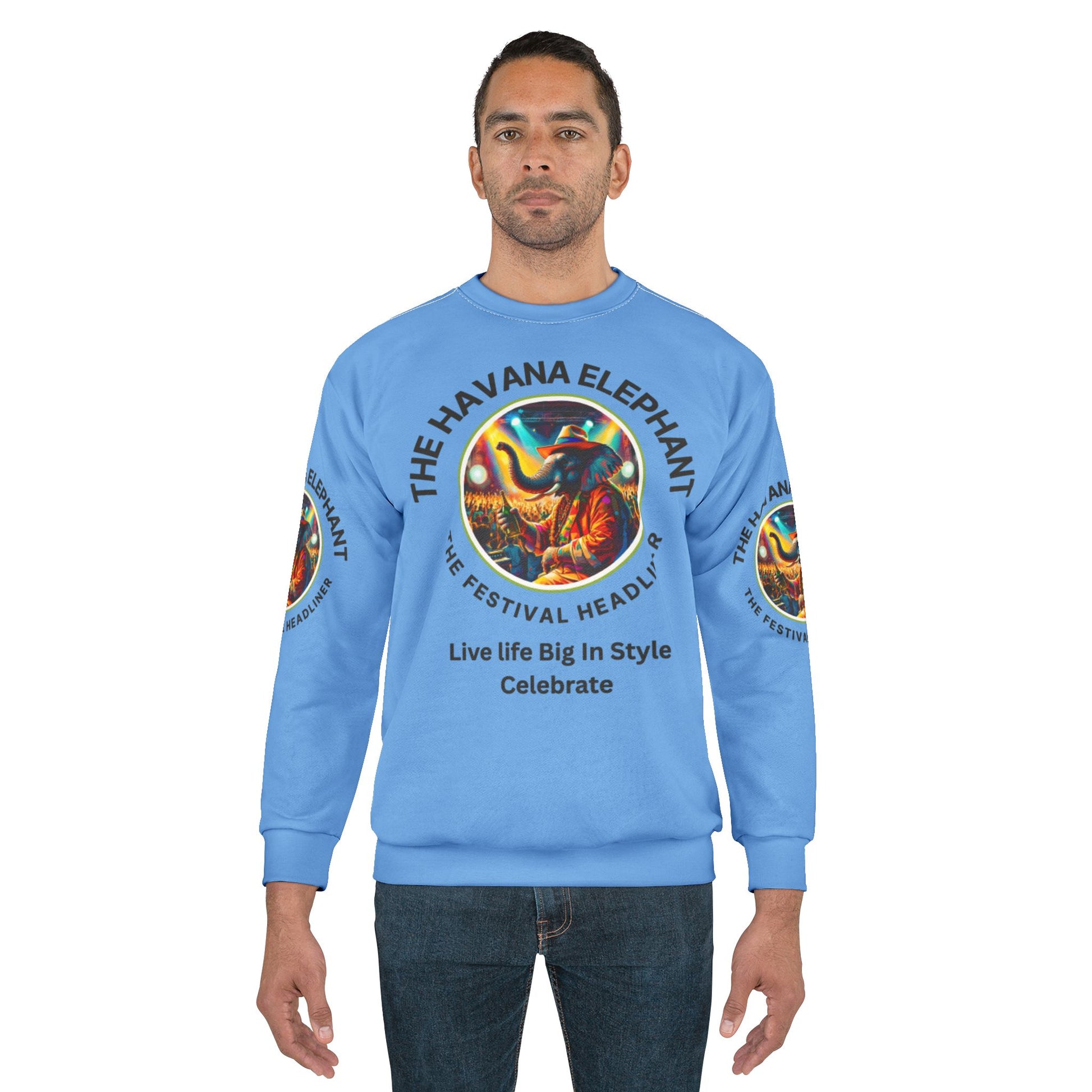 This Havana Elephant themed crewneck sweatshirt is the perfect example of cool, ideal for the funky casual all year round. The Havana Elephant Festival headliner is the ultimate party upper. This fleece sweatshirt is custom cut and sewn, featuring a crew neck and set-in sleeves to keep you warm. It is relevant for those who love vibrant and unique designs, suitable for festivals, parties, and casual wear.