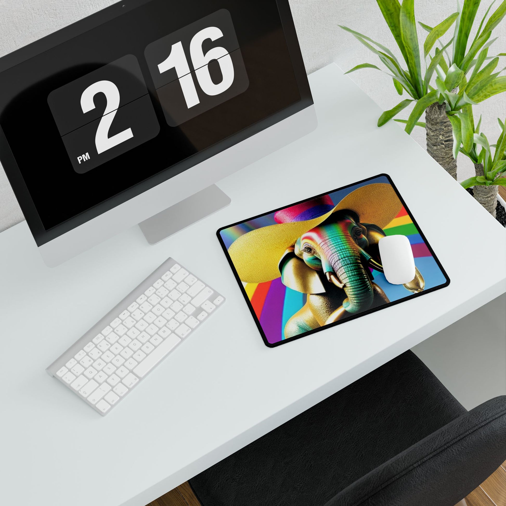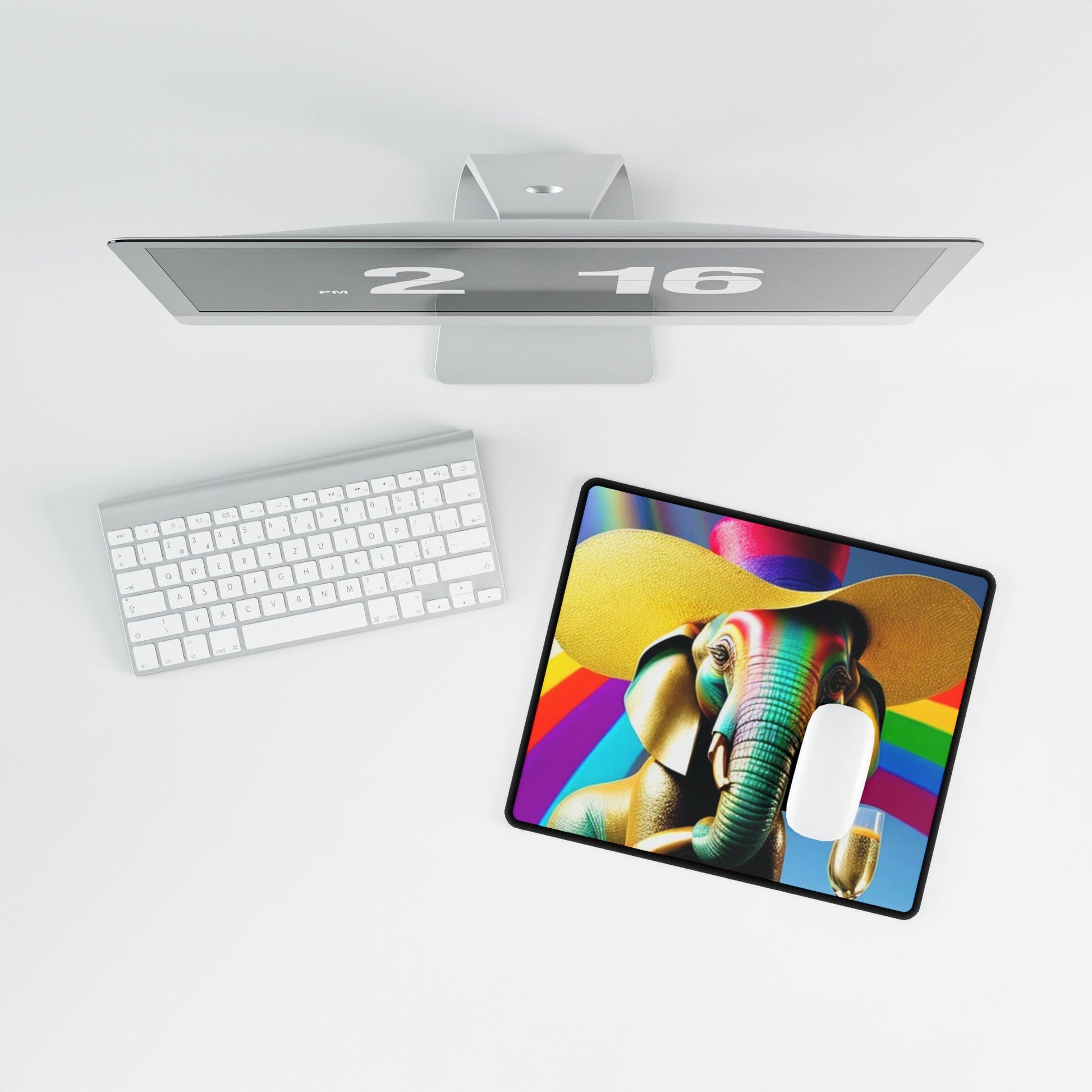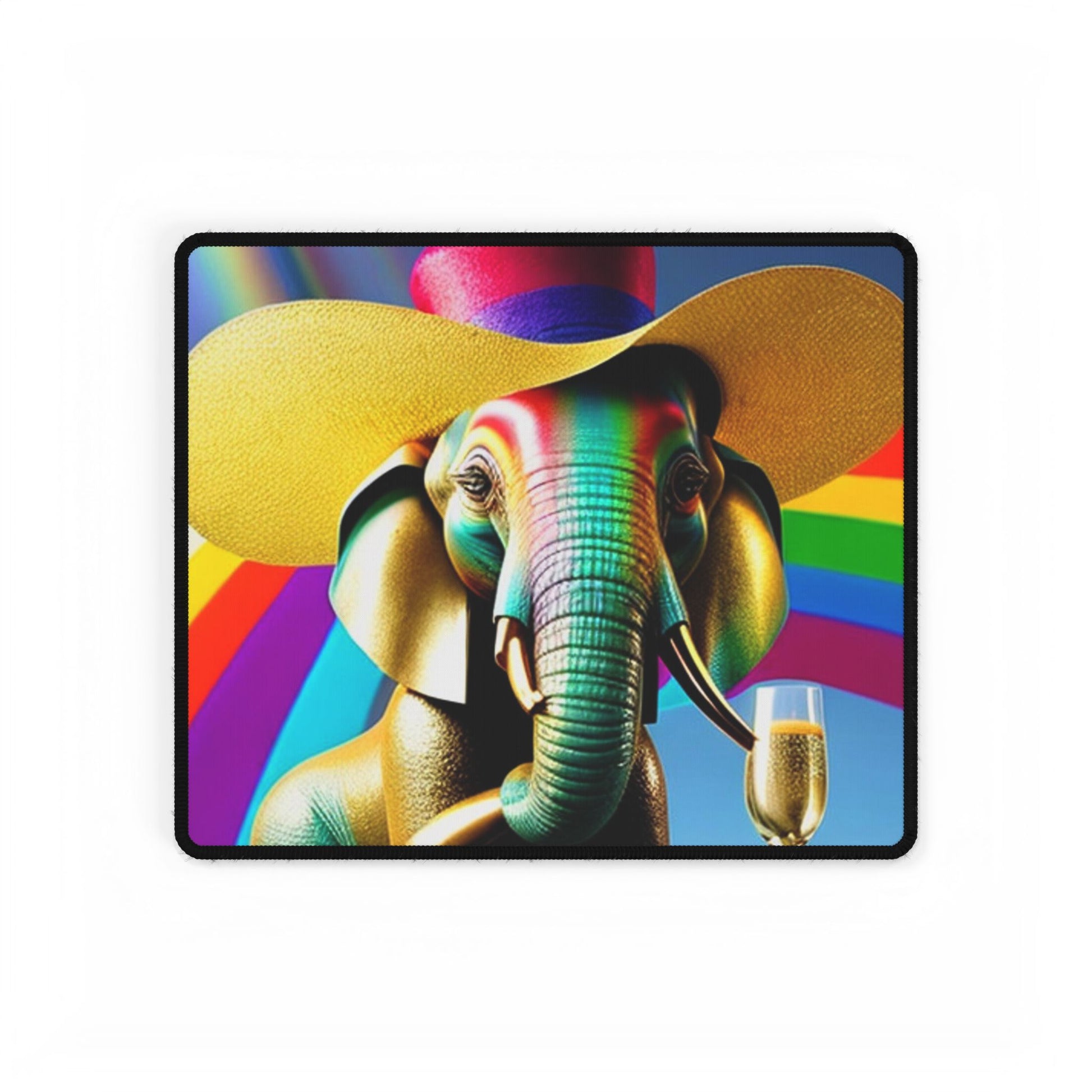 What a great desk mat to look down on. keeps you you in the right mood, puts a smile on your face. A rainbow elephant in a funky hat celebrating with a glass of bubbles. Apart from looking cool, these desk mats keep surfaces free from scratches and stains. Great for making spaces more organized with minimal effort. These mats have a smooth surface and a non-slip base. They're durable and will last long without fraying or pilling. Optical and laser mice are supported.